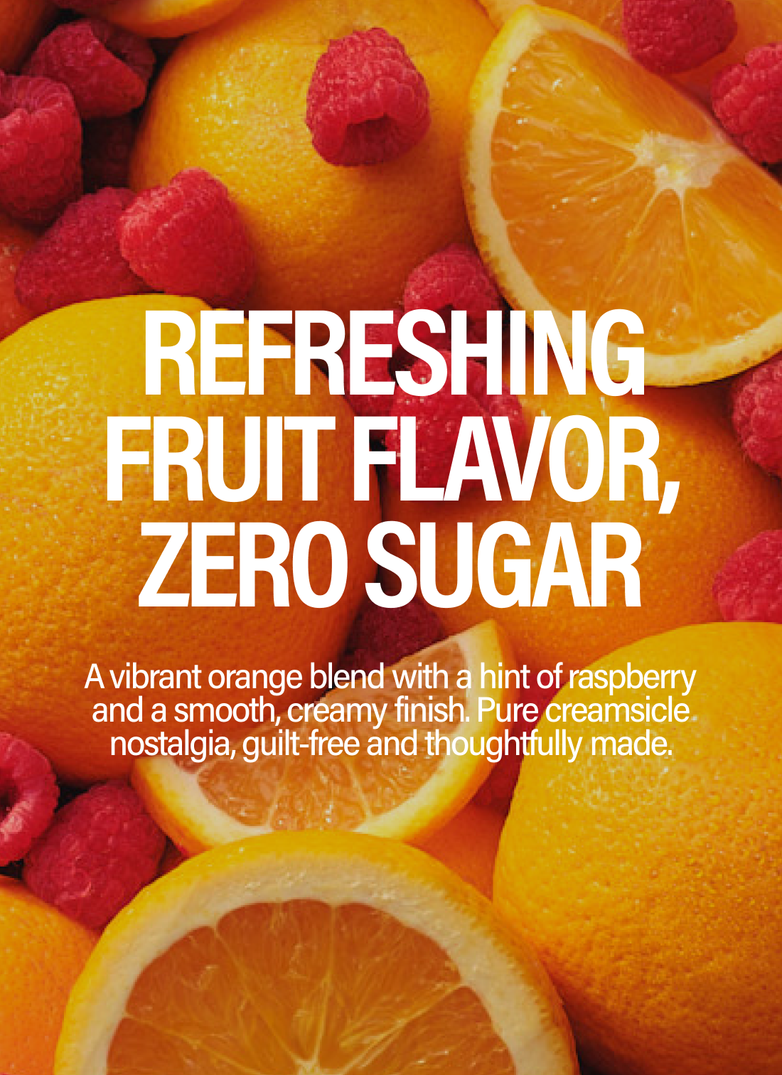 A vibrant orange blend with a hint of raspberry and a smooth, creamy finish. Pure creamsicle nostalgia, guilt-free and thoughtfully made.